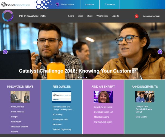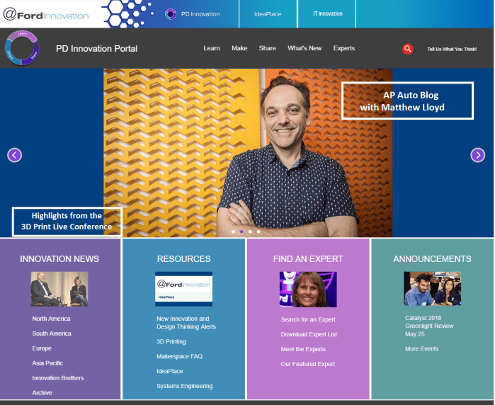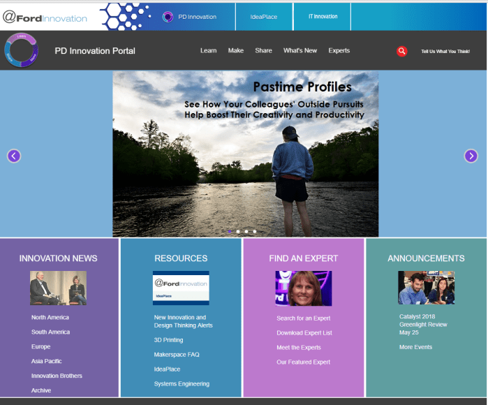 2017-2018 Page layout examples. I was responsible for all the design and content for the PD Innovation Portal, an internal website for Ford Product Development innovators.